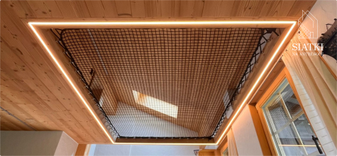 Siatki na antresole to napięte powierzchnie montowane w otworze stropowym lub nad przestrzenią mieszkalną. Tworzą bezpieczne miejsce do leżenia i odpoczynku, a jednocześnie doświetlają wnętrze i robią mocny efekt wizualny. Wykonujemy je na wymiar — pod konkretny kształt i mocowania.